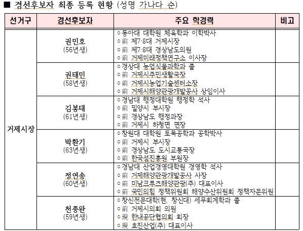 경선 후보자(가나다 순)는 ▲권민호(69) 전 거제시장 ▲권태민(68) 전 거제시해양관광개발공사 상임이사 ▲김봉태(64) 전 밀양시 부시장 ▲박환기(62) 전 거제시 부시장 ▲정연송(66) 전 거제해양관광개발공사 사장 ▲천종완(66) 전 거제시의회 의원 등 6명이다.