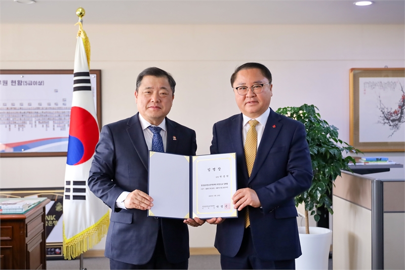 박명균 경남도청소년지원재단 이사장(왼쪽)과 박춘덕 청소년지원재단 원장이 임명장 수여식을 하고 기념사진을 찍고 있다. 이상 경남도