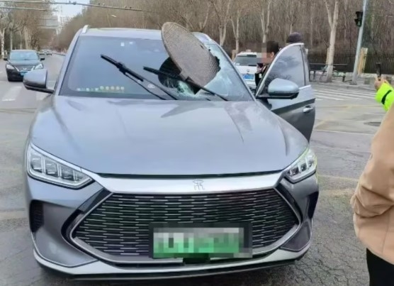 맨홀 뚜껑이 앞유리에 박힌 모습. 바이두