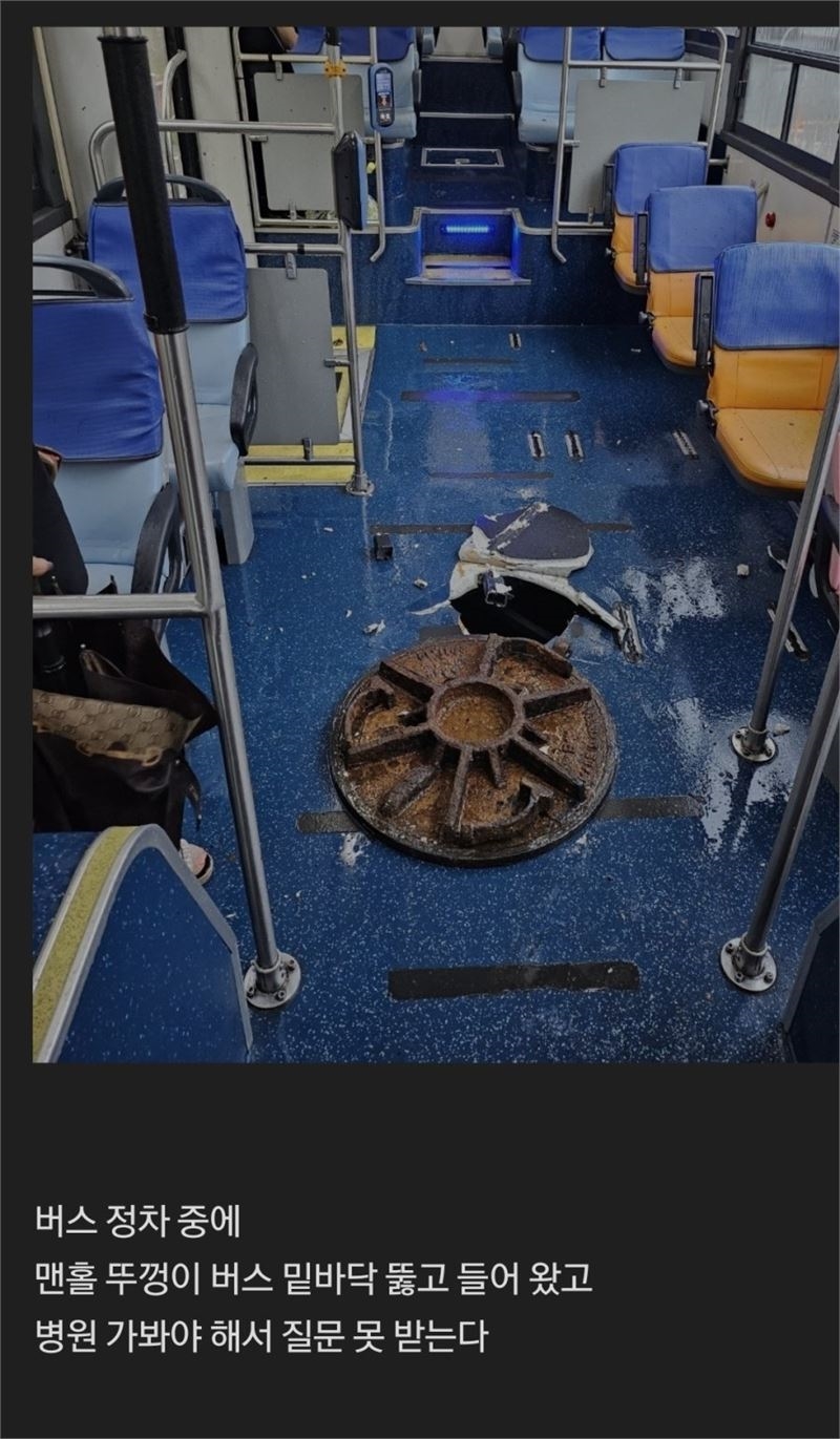 이 버스에 타고 있던 승객은 온라인 커뮤니티에 사진을 올리면서 "갑자기 굉음이 나면서 버스 안으로 맨홀 뚜껑이 버스 밑바닥을 뚫고 솟구쳐 승객들은 혼비백산 했다. 다행히 솟구쳐 오른 곳엔 승객이 없었지만 놀란 일부 승객은 병원으로 가 진찰을 받았다"고 전했습니다.