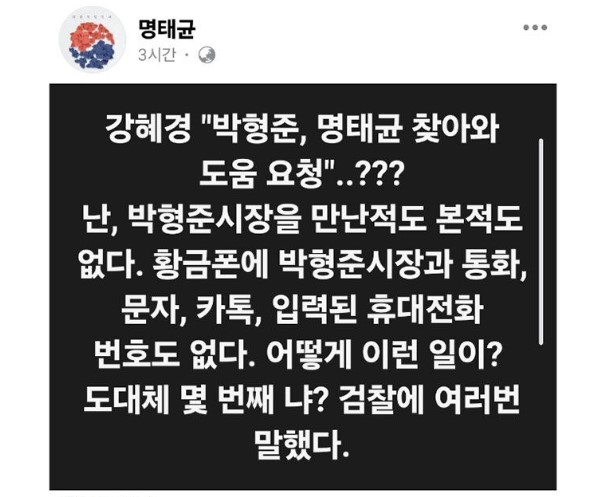 명 씨는 자신의 SNS에 "강혜경 '박형준, 명태균 찾아와 도움 요청???' 난 박형준 시장을 만난 적도 본 적도 없다"고 적었다.
