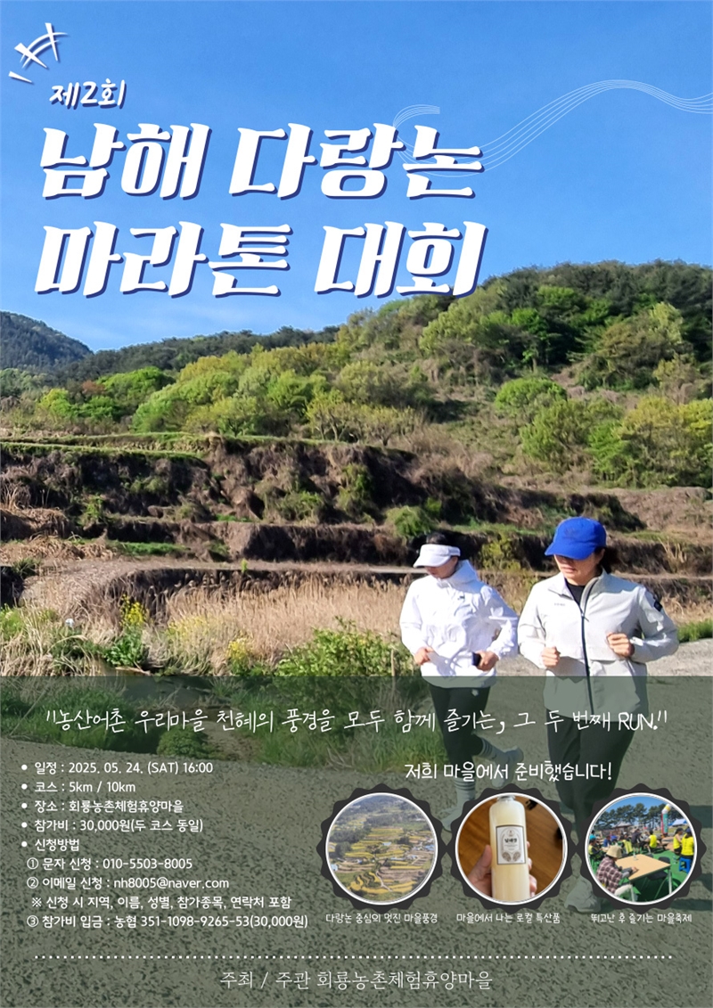 이정만 회룡농촌체험휴양마을 위원장은 “제2회 남해 다랑논 마라톤 대회에서 멋진 봄날의 추억과 함께 달리기의 낭만을 즐기시길 바란다”고 밝혔다.