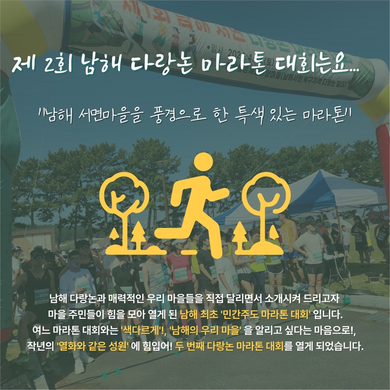이번 마라톤 축제는 단순한 레이스가 아니라 남해의 정취와 공동체의 따뜻함을 느낄 수 있는 체험형 축제로 기획됐다. 회룡농촌체험휴양마을에서 주최 및 주관한다.