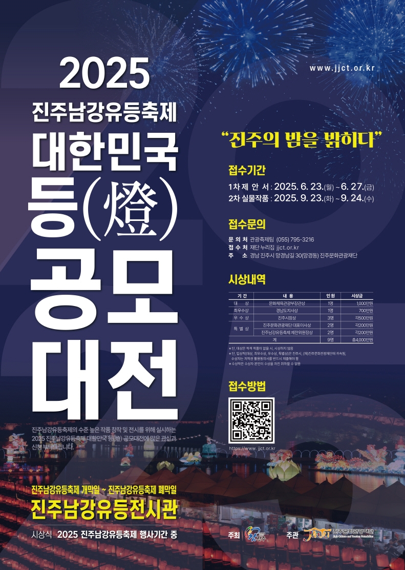경남 진주시가 주최하고 (재)진주문화관광재단이 주관하는 '2025 진주남강유등축제 대한민국 등(燈)공모대전'이 ‘진주의 밤을 밝히다'를 주제로 개최된다. 오는 6월 23일부터 27일까지 참가 접수를 받는다.