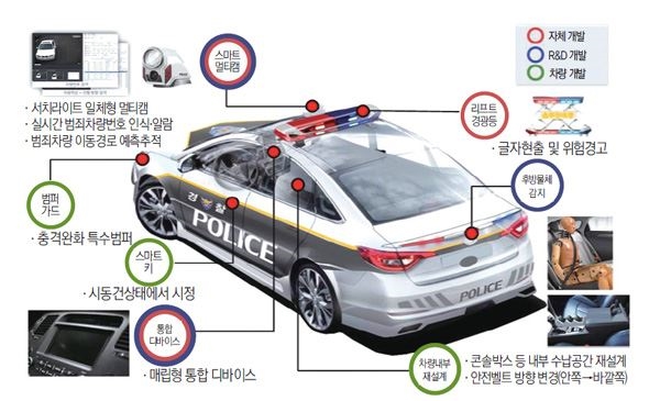 범죄차량 인식 멀티캠과 특수범퍼 등 첨단기능을 장착한 '한국형 스마트 순찰차' 제원. 경찰 순찰차 뒷좌석은 범죄 혐의자 등이 운행 중 뛰어내릴 우려를 방지하기 위해 안에서는 문을 열지 못하는 시스템을 갖추고 있다. 경찰청