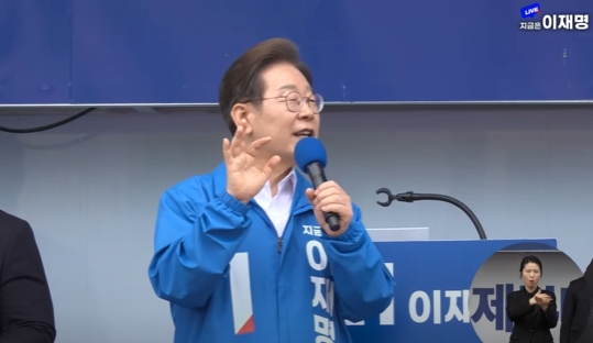 이재명 더불어민주당 대통령 후보가 14일 경남 창원시 성산구 상남분수광장에서 유세를 하고 있다. 델리민주