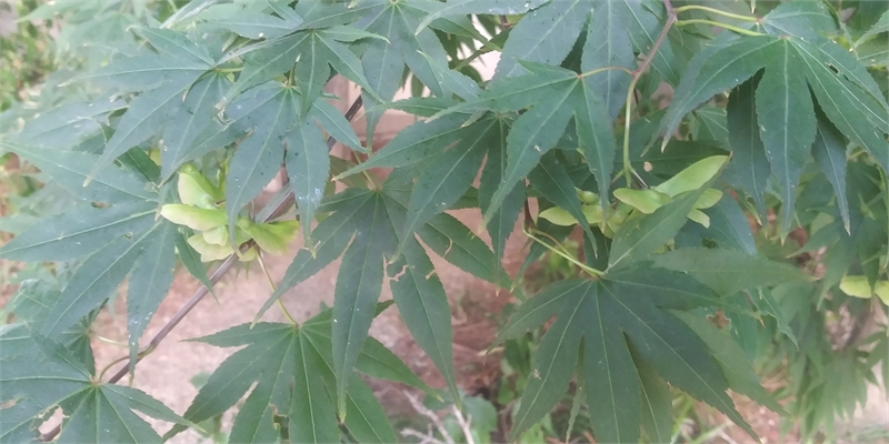 푸른 단풍잎 아래에 연한 열매 꼬투리가 열려 있다. 뾰족한 단풍잎과 달리 생김새가 뭉텅하고 나비가 앉은 것 같기도 하고, 강낭콩이 달린 것 같기도, 비행체의 프로펠러 같기도 하다.