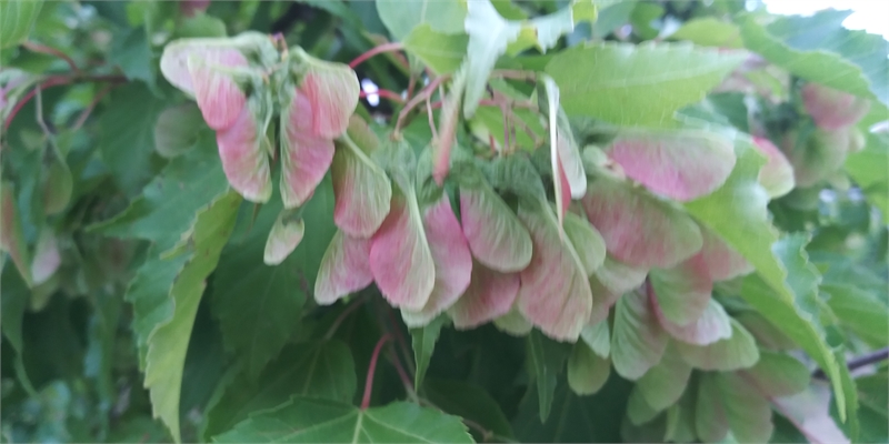사이시옷(ㅅ) 모양의 단풍나무 열매 꼬투리. 색상도 연초록색과 연분홍색이 혼재돼 꽃처럼 예쁘다.