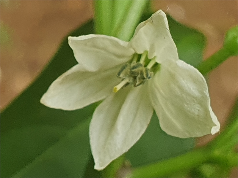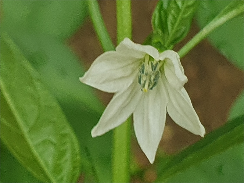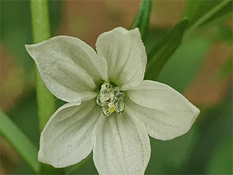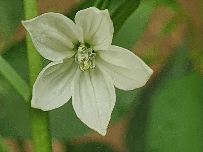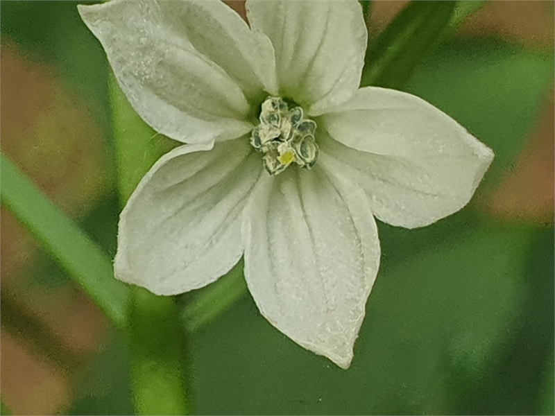 하얀 고추꽃 모습. 주위엔 꽃봉오리가 맺혀있다.