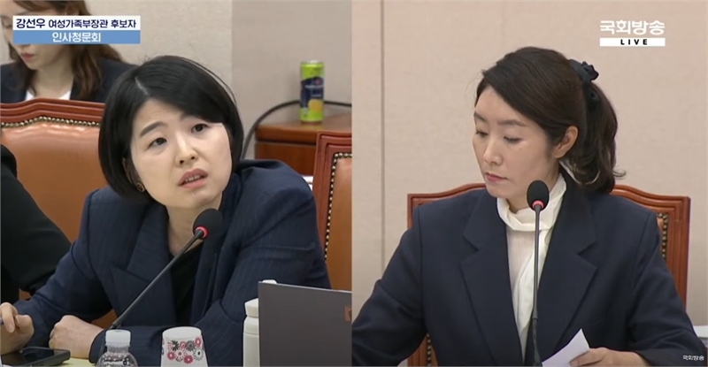 한지아 국민의힘 의원이 14일 강선우 여성가족부 장관 후보자 인사청문회에서 강 후보자에게 질의하고 있다. 국회방송