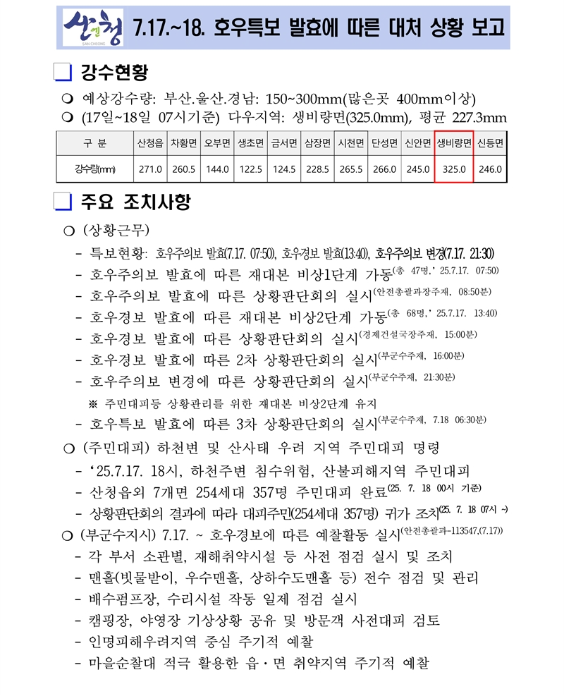 또 이날 오후 4시 5분 산청군 신등면 간공리 연산마을에 내린 폭우로 토사가 밀려 내려와 주택 1채를 덮쳤다. 이 사고로 60대 여성 1명이 토사에 하반신이 깔렸지만 출동한 경남특수대응단이 오후 5시 14분 이 여성을 구조했다.