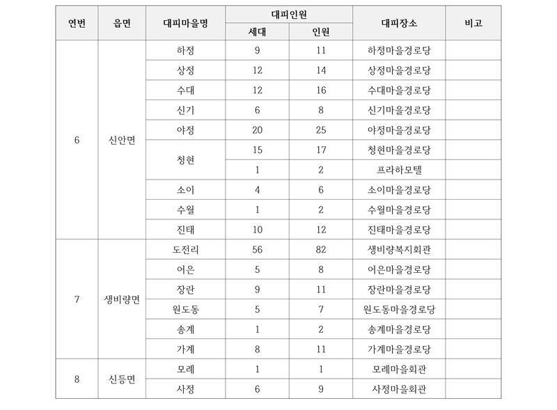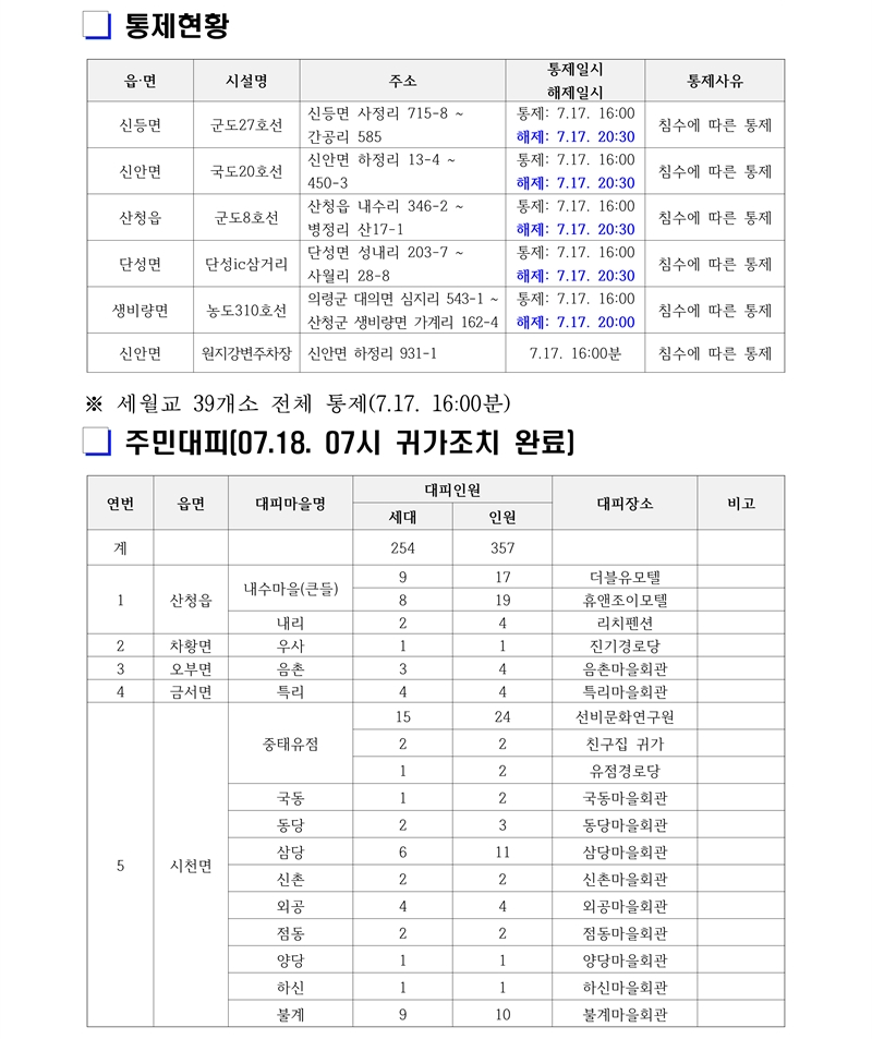 또 시천면 유정마을 주민 26명이 선비문화원으로, 신안면 5개 마을 주민도 안전한 곳으로 대피했다.