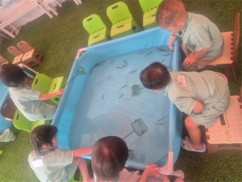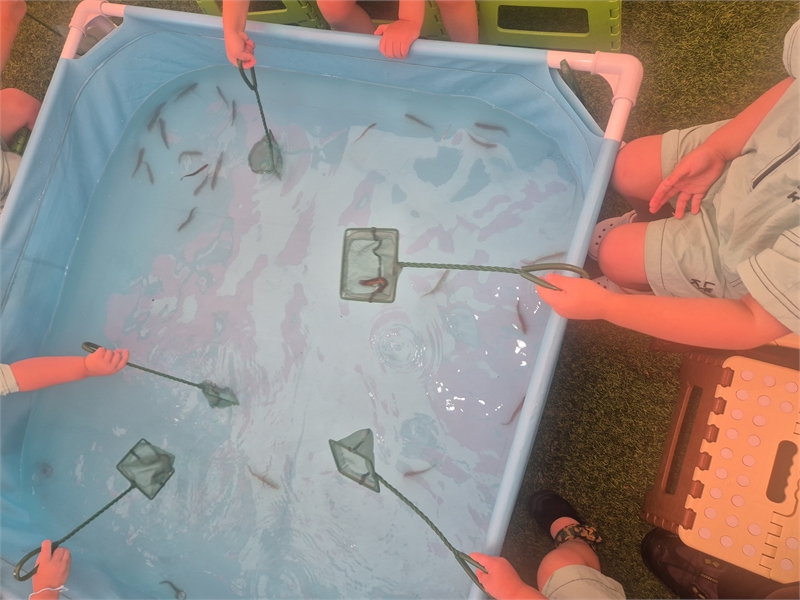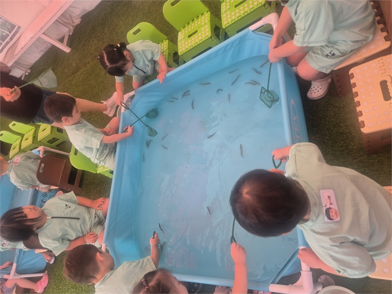 아이들이 의자에 앉아 작은 채를 움직이며 미꾸라지를 잡고 있다. 피해 도망을 가는 미꼬라지를 잡기란 쉽지 않다. 아이들의 어설픈 손놀림에 '미꾸라지처럼 잘도 빠져나간다'는 말이 와닿는다.
