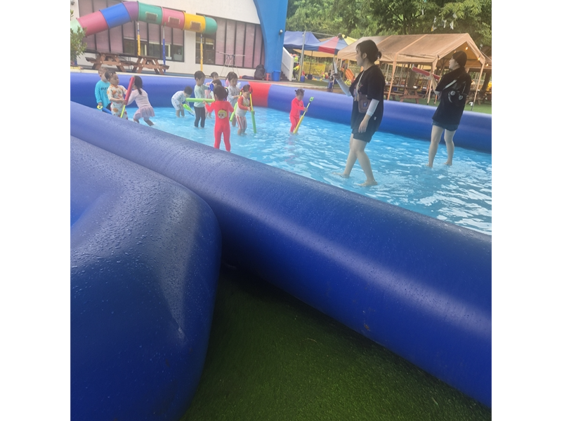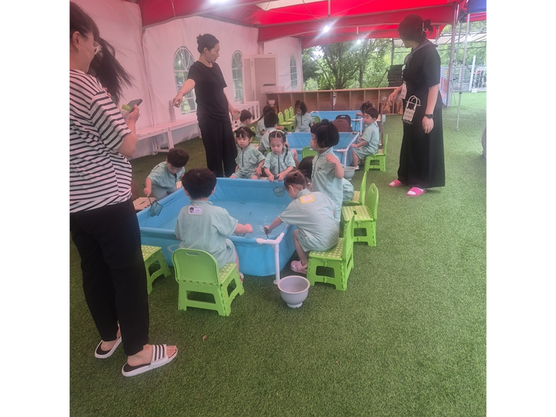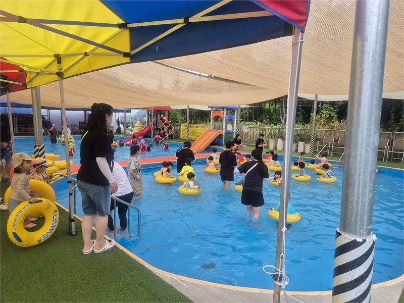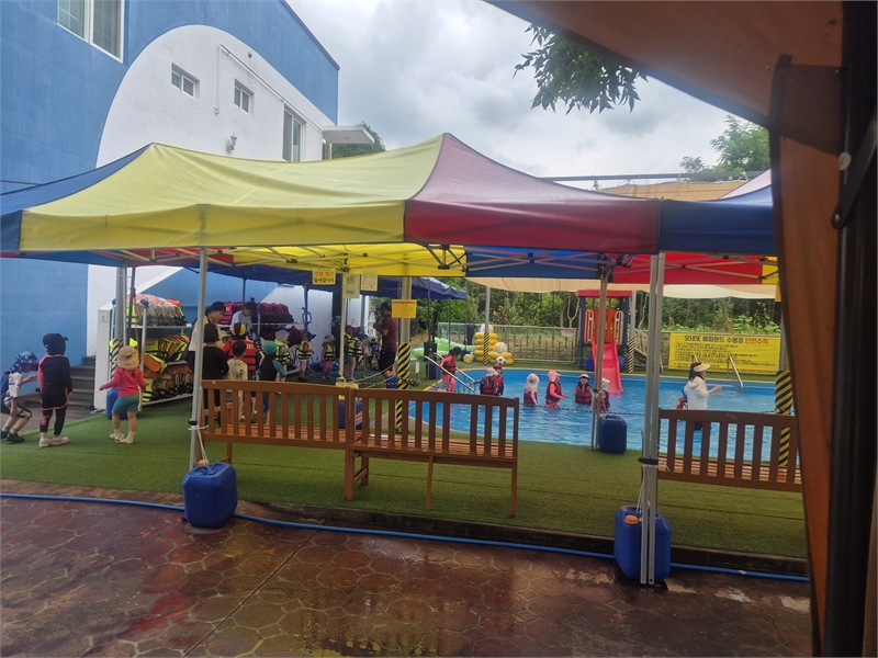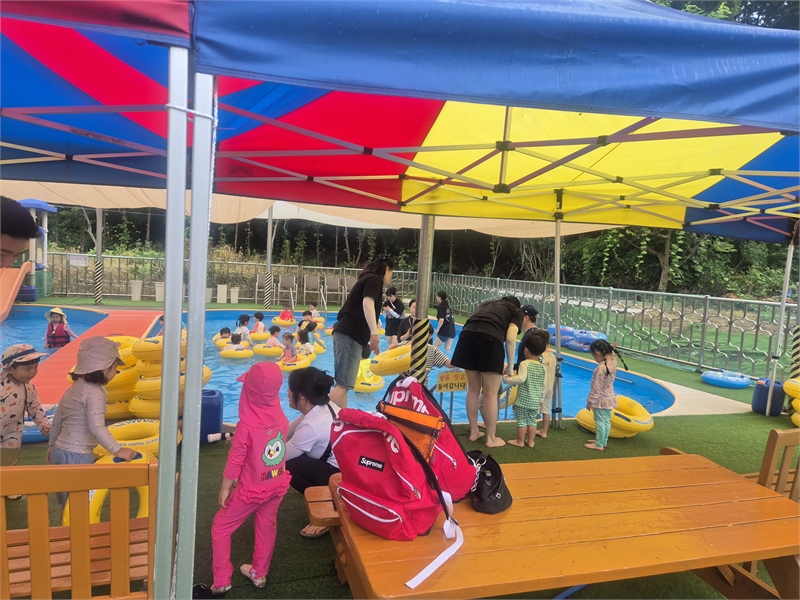아이들이 물놀이를 하며 즐기고 있다. 옆엔 안전 사고를 예방하기 위해 인솔 선생들이 지켜보고 있다.