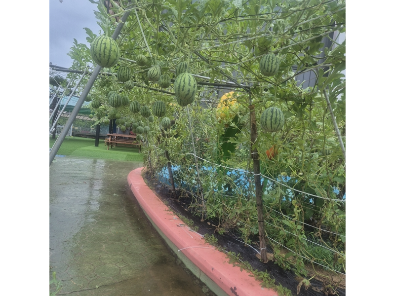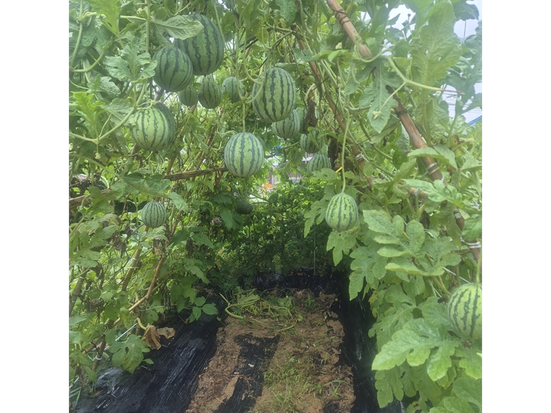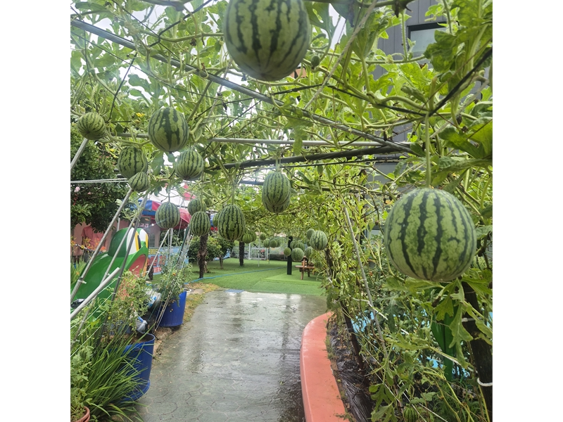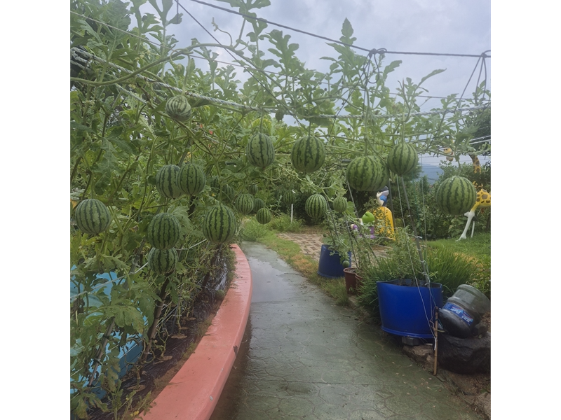 수박이 머리 위에 주렁주렁 달린 작은 수박 농원