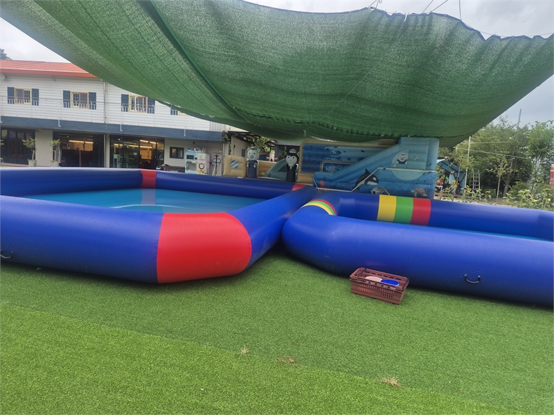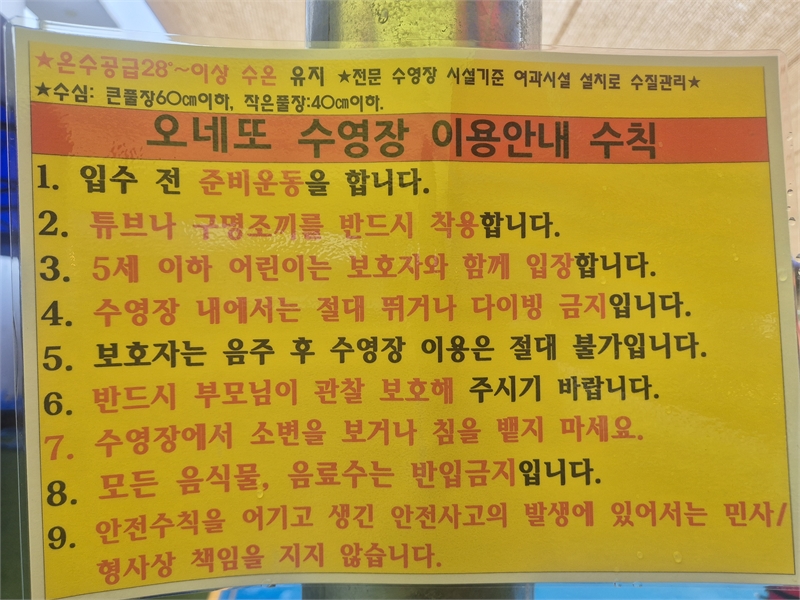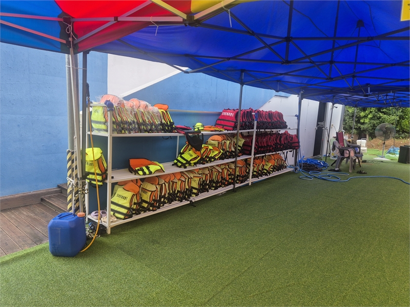 아이들이 수영장을 이용할 때 착용할 안전 구명조끼들이 가지런히 정리돼 있다.