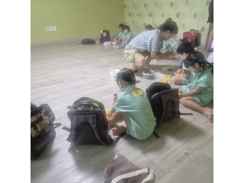 키즈카페에 도착한 아이들이 점심을 먹기 위해 싸 온 도시락을 꺼내고 있다.