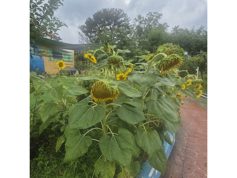 키즈카페 정원엔 노란 해바라기꽃과 큼지막한 열매가 열려 있다.