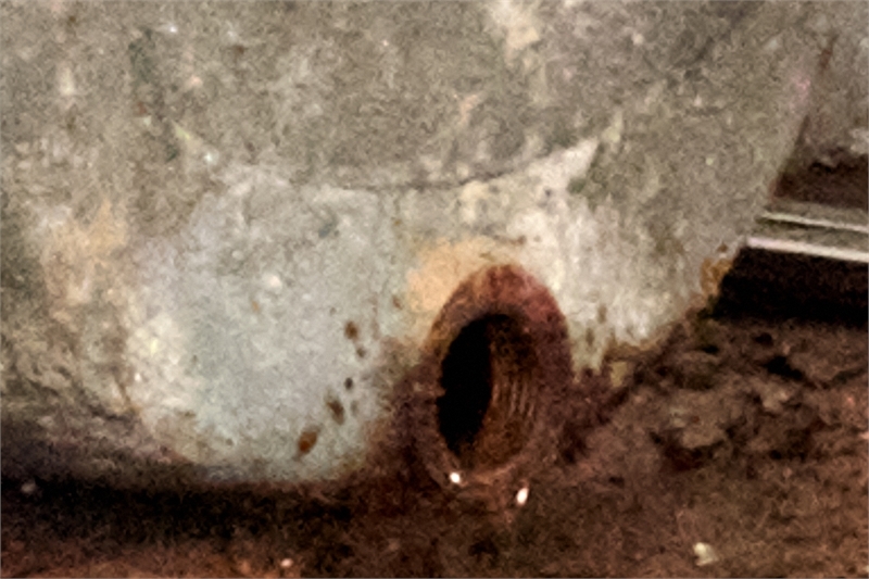 작은 배수 펌프의 아래쪽 볼트가 풀어져 없어진 모습. 이 펌프에 물이 고인 상태에서 추운 겨울에 방치하면 고장의 원인이 되기에 겨울엔 풀어서 내부의 물을 제거한다. 하지만 녹이 가득 슬어 있어 이 펌프를 가동한 지는 꽤 오래돼 보였다. 북마성마을 주민들이 진주시청 기자회견에서 관련 사진을 공개하기 전에 찍었다.