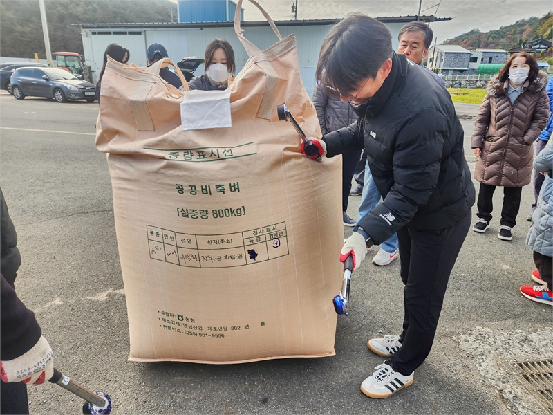 지난해 11월 경남 진주시 진성면 공공비축미 수매 현장 모습. 검사원이 등급을 매긴 뒤 톤백 부대에 등급 표시를 찍고 있다.