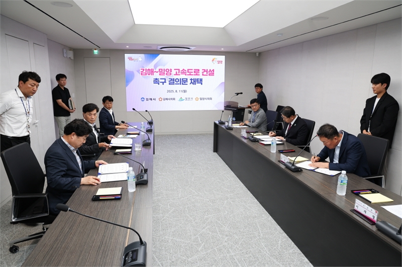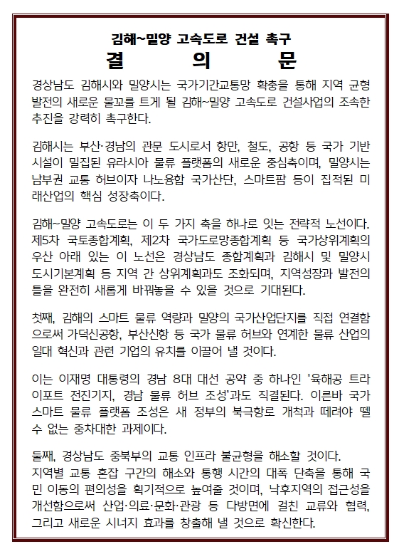 이들은 지역 간 연결성과 국가기간도로망 강화를 위해 김해~밀양 고속도로 건설사업의 조속한 추진과 예비타당성조사 통과를 촉구하는 내용의 결의문에 사인했다.