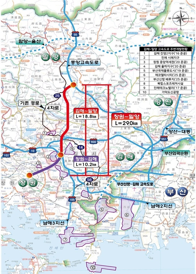 김해~밀양 고속도로 건설사업은 총연장 18.8km 규모로 김해 진례IC와 남밀양IC를 연결하는 노선이다. 이 노선은 남해고속도로, 중앙고속도로, 중부내륙고속도로를 연계하는 핵심 구간으로 완공 시 부산·경남 내륙권 간 통행시간이 획기적으로 단축되고 물류 흐름의 효율성이 대폭 향상될 것으로 기대된다.