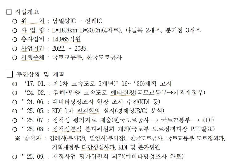 김해시 관계자는 “김해~밀양 고속도로는 단순한 교통 인프라 확장 차원을 넘어 지역의 지속가능한 발전 기반을 다지는 중요한 전환점”이라며 “시민의 염원을 모아 반드시 예타를 통과하고 조속히 착공될 수 있도록 총력을 다하겠다”고 밝혔다.