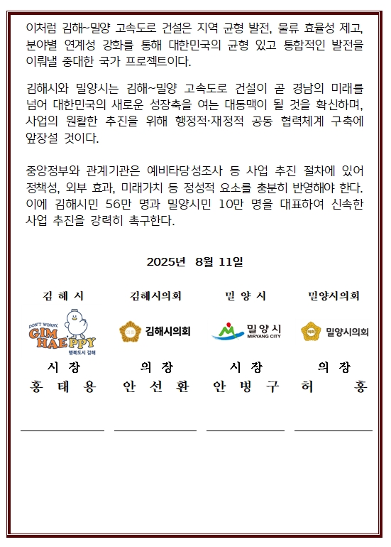 결의문에서 양 시는 ▲동남권 광역 교통체계 확립 ▲지역 간 물류비용 절감 ▲도시 간 접근성 향상 ▲국가 균형발전 기여 등을 근거로 김해~밀양 고속도로 건설이 반드시 필요하다고 강조했다.