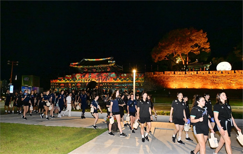 대회 휴식일이던 지난 14일 대회 참가 6개국 국가대표 선수단 130여 명은 진주의 대표 야간관광 콘텐츠인 ‘2025 국가유산 미디어아트 진주성’을 특별 관람했다.