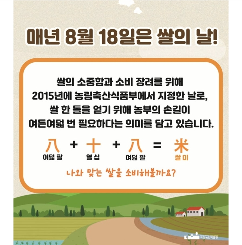 한자 쌀 미(米)를 풀면 여덟 팔(八), 열 십(十), 여덟 팔(八), 즉 '八, 十, 八'이 나온다 해서 8(八)월 18(十八)일을 쌀의 날로 정했다.