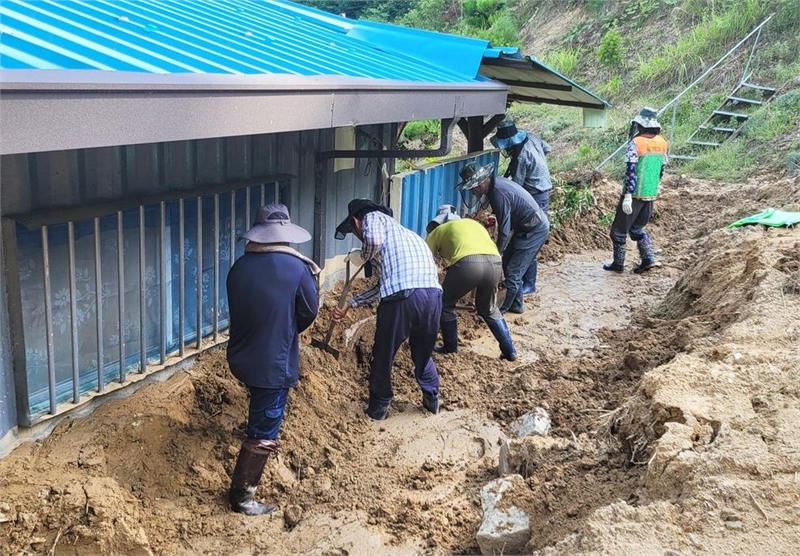 지난 7월 23일 집중호우로 주암마을 어르신 가옥에 쏟아져 내린 토사를 자원봉사자들이 걷어내고 있다. 함양군