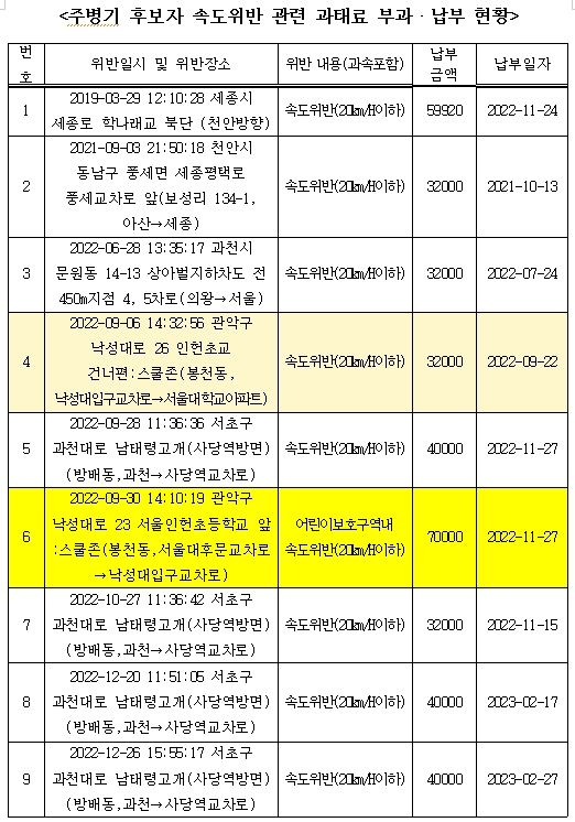 어린이 보호구역 외에도 주 후보자는 ▲서울인헌초교 건너편 스쿨존 ▲세종시 소재 어린이집 앞 ▲과천시 어린이교통공원 앞 등 어린이의 통행이 활발해 특별히 주의가 필요한 여러 장소에서도 무려 4차례나 제한속도를 위반한 사실이 확인됐다.