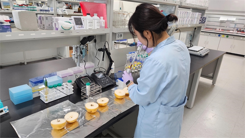 진주시농업기술센터 직원이 배 전분 함량을 측정하고 있다.