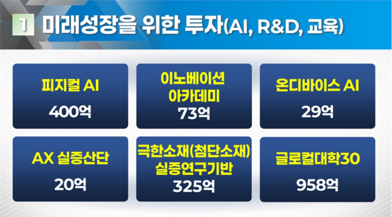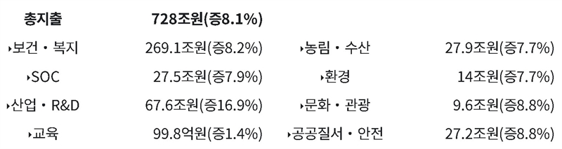 내년 정부예산안 증가율은 8.1%(728조, 전년 대비 54조 7천억 증액)로, 인공지능(AI)와 연구개발(R&D), 균형발전, 저출생·고령화 대응 및 사회안전망 강화, 국민안전 확보 등에 중점을 뒀다.