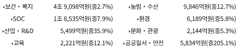 정부예산안에 반영된 분야별 주요 내용은 아래와 같다.