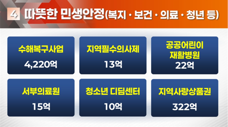 최근 급격한 기후 변화로 산불, 산사태, 집중호우 등 재난·재해가 빈번해지고, 의정 갈등으로 인해 취약계층과 환자들의 의료피해를 입었으며, 내수 침체로 소상공인·자영업자가 큰 어려움을 겪었다. 도민의 안전과 민생안정을 지켜내기 위한 예산이 상당수 반영됐다.