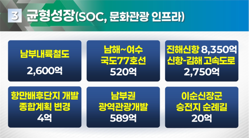 도내 지역별 발전 양상에 차이가 있어 성장 잠재력을 충분히 활용하지 못하고 있다. 이를 해소하기 위해 사람과 물자가 쉽게 이동할 수 있도록 기반시설을 갖추고, 경남의 균형성장을 이끌어갈 주요 사업이 대거 반영됐다.