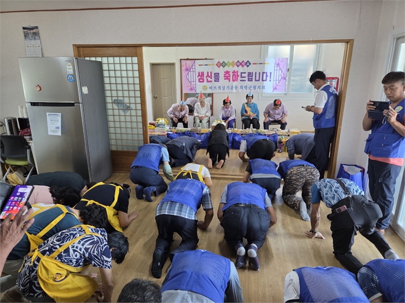바르게살기운동 의령군협의회 회원들이 홀로사는 어르신 5분의 생신상을 차린 뒤 만수무강을 기원하며 큰절을 올리고 있다.