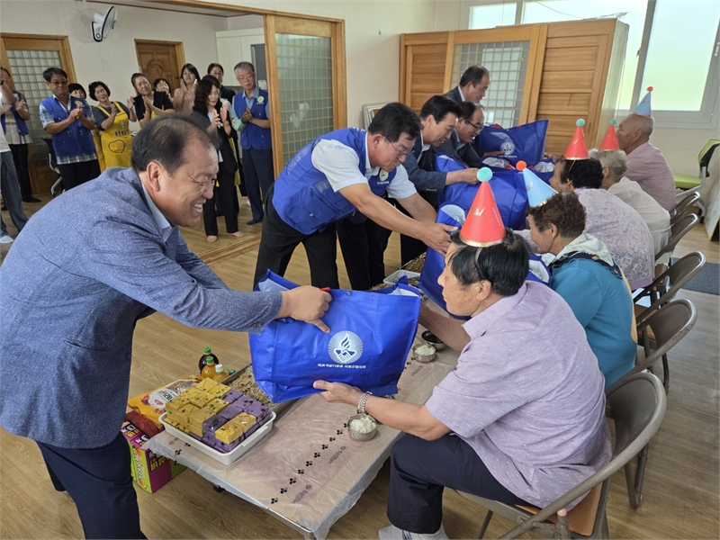 바르게살기운동 의령군협의회 회원들이 홀로사는 어르신 5분의 생신상을 차린 뒤 준비한 선물을 주고 있다. 이상 의령군
