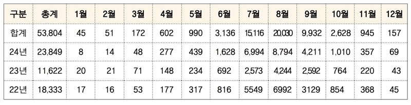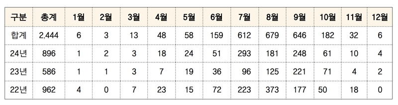 도 소방본부 출동 통계에 따르면 최근 3년간인 2022~2024년 사이 도내에서 발생한 벌 쏘임 사고는 모두 2444건으로 집계됐다. 이 가운데 1325건이 8월과 9월에 발생해 전체의 절반이 넘는 54.2%를 차지한 것으로 나타났다.