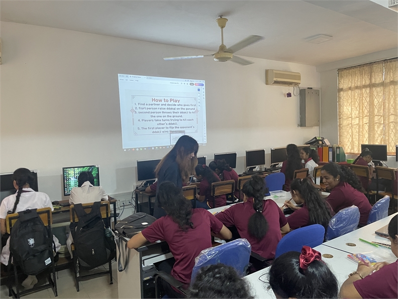 '사천온(溫)택트' 팀원이 스리랑카의 사무드라데비 발리카 비디알라야 여학생들에게 IT 교육과 한국의 전통 문화를 가르치고 있다.