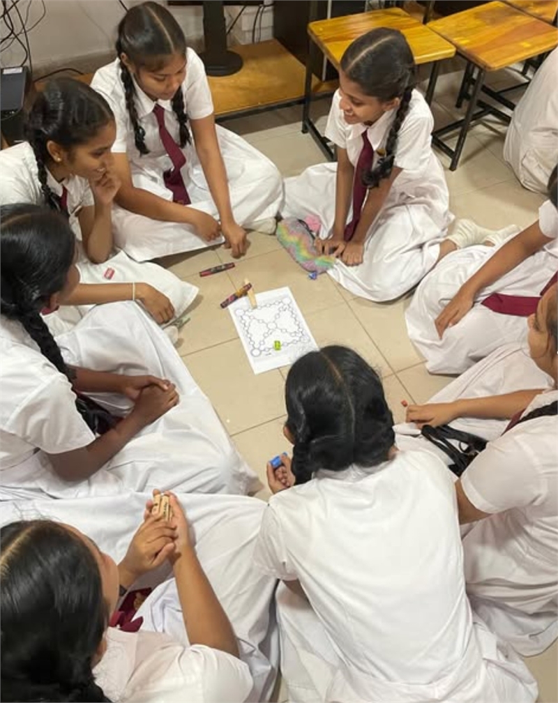 스리랑카의 사무드라데비 발리카 비디알라야 여학교 학생들이 한국의 전통놀이인 윷놀이를 하며 흥미로워하고 있다.