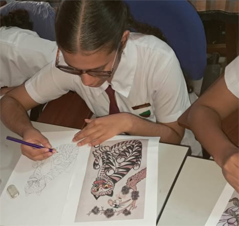 스리랑카의 사무드라데비 발리카 비디알라야 여학교 학생들이 한국 전통 민화인 호작도(虎鵲圖), 즉 호랑이와 까치를 그리고 있다.