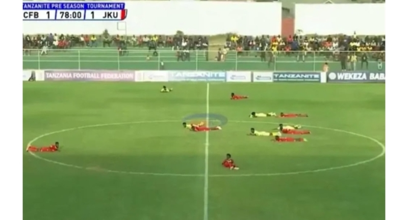 아프리카 탄자니아 축구 경기 중 선수들이 벌떼가 난입하자 납작 엎드린 모습. 더선