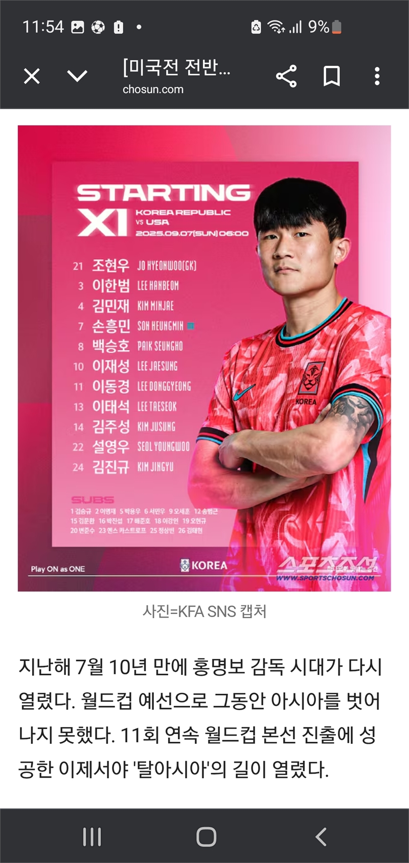 한국은 주장 완장을 찬 손흥민을 원톱으로 세우고 김민재(바이에른 뮌헨)을 중심으로 한 스리백을 내세웠다.