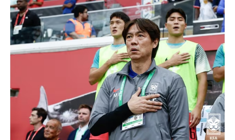 홍명보 감독이 가슴에 손을 얹고 애국가를 부르고 있다. 이상 KFA
