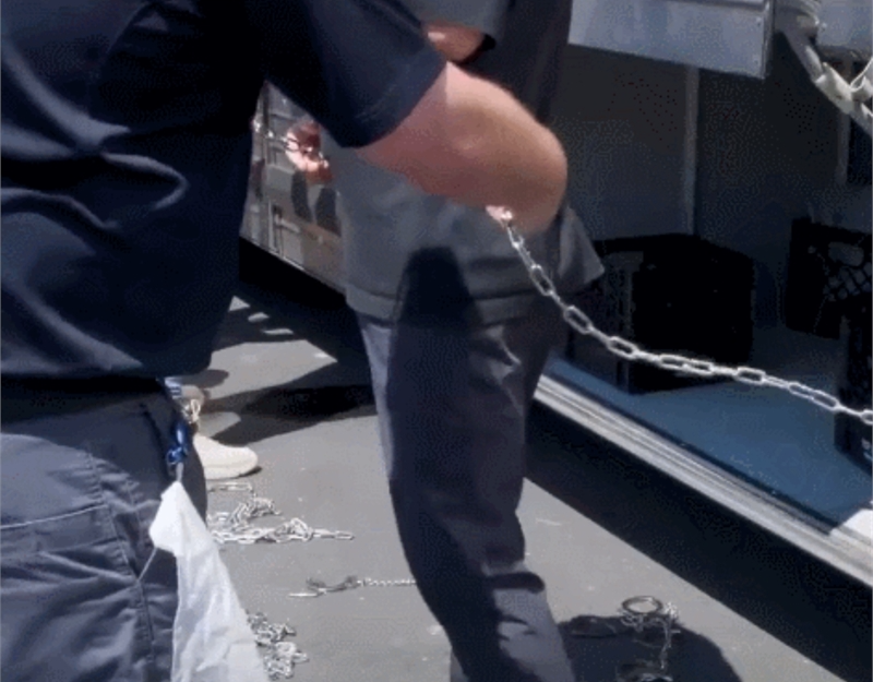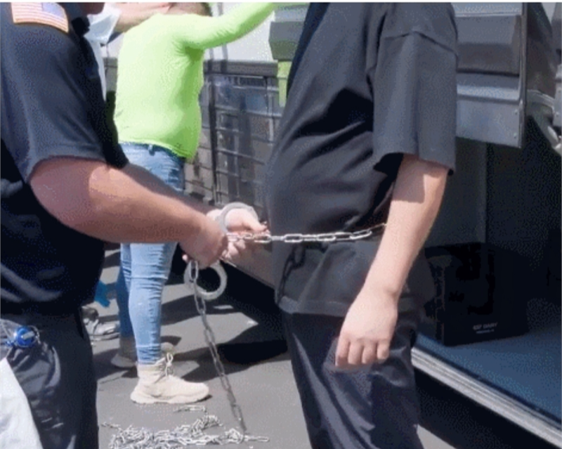 미국 이민 당국 대원이 우리 근로자를 쇠사슬로 몸을 묶고 있다. ICE 홈페이지