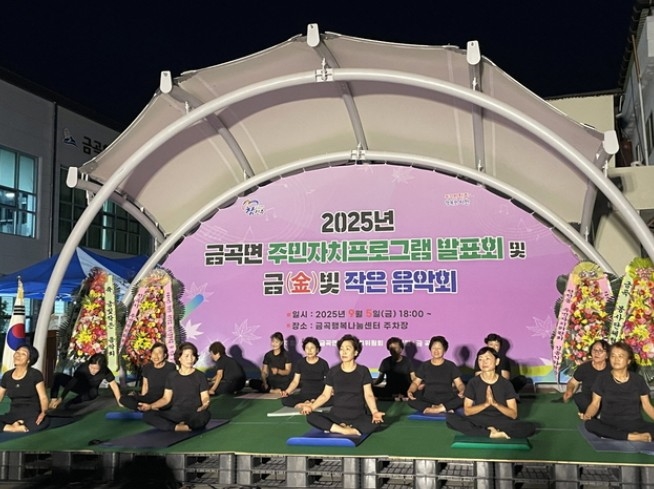 ‘2025년 금곡면 주민자치 프로그램 발표회 및 금(金)빛 작은 음악회’에서 주민들이 면 주민자치센터에서 배운 요가를 선보이고 있다.