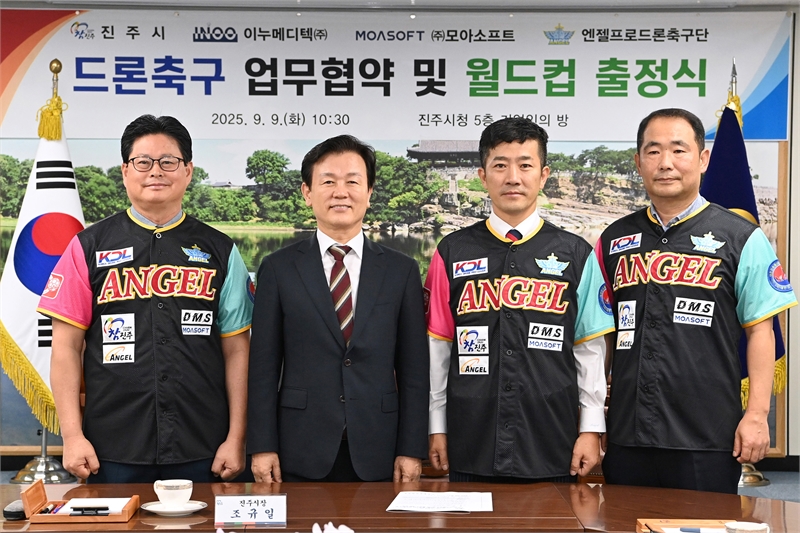 경남 진주시는 9일 이누메디텍㈜, 엔젤드론축구단과 함께 드론축구 활성화를 위한 3자 업무협약(MOU)를 하고 오는 25일 열리는 ‘2025 전주 드론축구 월드컵’에 참가하는 엔젤드론축구단의 출정식을 가졌다.
