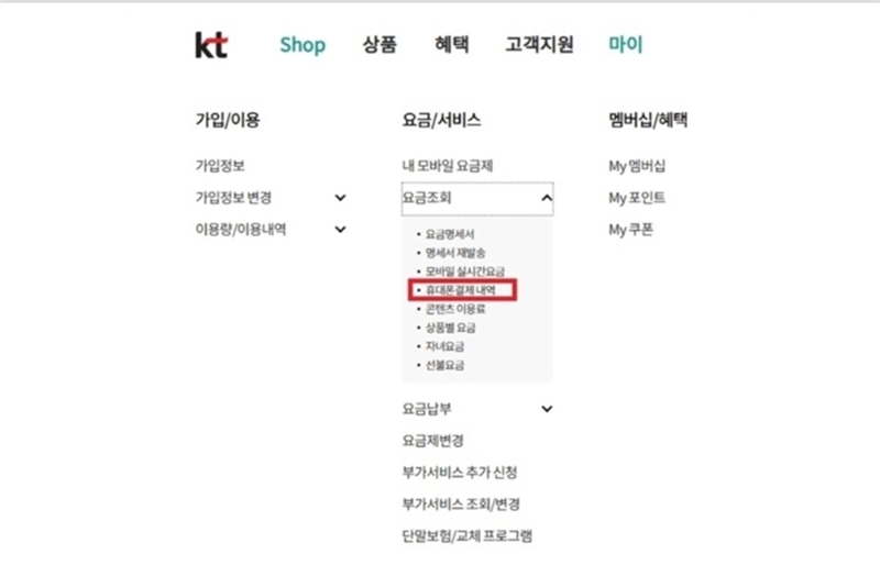 KT 홈페이지 ‘휴대폰 결제내역’에서 소액결제 설정을 변경하는 방법. KT 홈페이지